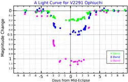 ![]() Visible, blue and ultraviolet light curves for an eclipse of V2291 Ophiuchi, adapted from Griffin et al. (1995)[1] | |
