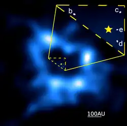 ![]() HR 8799 (marked with star) with HR 8799 e (upper right), HR 8799 d (lower right), HR 8799 c (up from HR 8799 e) and HR 8799 b (left) from James Webb Space Telescope | |