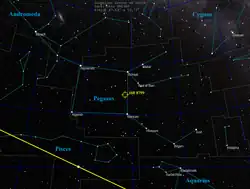 HR 8799 is a star that is visible to the naked eye. It has a magnitude 5.96 and it is located inside the western edge of the great square of Pegasus almost exactly halfway between Beta and Alpha Pegasi. The star's name of HR 8799 is its line number in the Bright Star Catalogue.