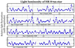 - ↑ Wright, D.J.; Chené, A.-N.; de Cat, P.; Marois, C.; Mathias, P.; Macintosh, B.; et al. (February 2011). "Determination of the inclination of the multi-planet hosting star HR 8799 using astero-seismology". The Astrophysical Journal Letters. 728 (1): L20. arXiv:1101.1590. Bibcode:2011ApJ...728L..20W. doi:10.1088/2041-8205/728/1/L20. S2CID 119297114.