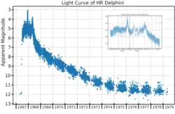 HR Delphini was discovered 158 days before it reached peak brightness, and its light curve around the peak was very well observed.[7] It had a very slow rise to maximum brightness, when compared to other classical novae.[3] It took 230 days for HR Delphini to fade from its peak by 3 magnitudes, which makes it a "slow" nova.[2] Its decline from peak brightness showed several brief outbursts, leading to its light curve being classified as type "J" (for "jitters").[9]