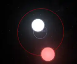 Based on variations in the timing of the system's eclipses, in 2008 it was claimed that two giant planets were in orbit around the binary, with masses of 8.47 and 19.2 times the mass of Jupiter orbiting with periods of 9.1 and 15.8 years respectively.[8] The proposed system was later shown to be extremely unstable, with mean lifetimes less than 1000 years in the parameter space allowed by the uncertainties in the data.[9] An alternate, dynamically-stable orbital solution was proposed with a 14.3 Jupiter mass object on a 12-year orbit and an outer companion of 65 Jupiter masses on a 55-year orbit,[10] however it has been noted that the outer companion's orbital parameters are highly unconstrained, again casting doubt on the reality of this model.[9] The problems with modelling this system and the proposed planets orbiting several other post-common envelope binaries has led to the suggestion that the eclipse timing variations used to infer the existence of planets has a non-planetary origin.[11] The eclipse timing variations of HW Virginis were shown to be incompatible with all previous planetary system models as of 2018,[12] and again in 2021.[4] However, eclipse timing variations cannot be explained by known stellar mechanisms either.[4] There is tentative evidence for the presence of a planet from astrometric measurements,[13] with future data releases of the Gaia spacecraft[1] being predicted to be able to fully confirm this.