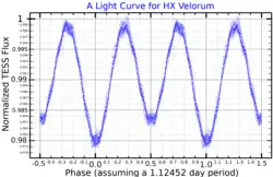 In 1981, Robert Shobbrook announced that HR 3462 is a variable star based on observations made in 1976. He correctly classified it as an ellipsoidal variable, but the period he derived, 0.56205±0.00005 days, was a factor of two too short because his data did not allow him to distinguish between primary and secondary minima in the light curve.[8] It was given the variable star designation HX Velorum in 1980.[9] In 1983, Christoffel Waelkens and Frédy Rufener published the correct period of variability, 1.124 days.[10]
