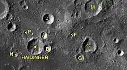 By convention these features are identified on lunar maps by placing the letter on the side of the crater midpoint that is closest to Haidinger.