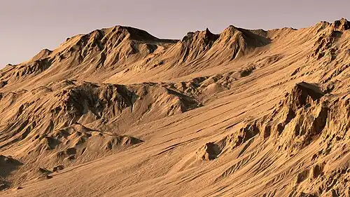 On 28 September 2015 NASA confirmed the seasonal existence of liquid water in Hale crater.[2] The salts in the water (magnesium perchlorate, magnesium chlorate, sodium perchlorate,...) lower its freezing and melting point to 203 K (−70 °C or −94 °F), which is near the average summer night temperature. Hale was created by an asteroid roughly 35 km (22 mi) across that impacted at an oblique angle about 3.5–3.8 billion years ago. The rim and ejecta are eroded and show smaller impacts, but subsequent deposits have covered up small craters within it.[3] On the southern rim of Hale, parts of the crater wall have moved downslope towards the crater's centre. The surface shows a network of fluvial channels which may have been caused by running water.[4] It is named after George Ellery Hale.