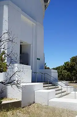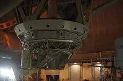 The moving weight of the upper dome is about 1000 US tons, and can rotate on wheels.[26] The dome doors weigh 125 tons each.[27] The dome is made of welded steel plates about 10 mm thick.[26]
