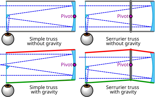 Right: Principle of operation of a Serrurier truss similar to that of the Hale Telescope compared to a simple truss. For clarity, only the top and bottom structural elements are shown. Red and green lines denote elements under tension and compression, respectively.