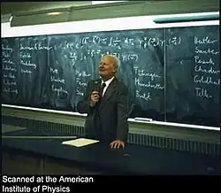 Bethe entered the University of Munich in April 1926, where Sommerfeld took him on as a student on Meissner's recommendation.[30] Sommerfeld taught an advanced course on differential equations in physics, which Bethe enjoyed. Because he was such a renowned scholar, Sommerfeld frequently received advance copies of scientific papers, which he put up for discussion at weekly evening seminars. When Bethe arrived, Sommerfeld had just received Erwin Schrödinger's papers on wave mechanics.[31]