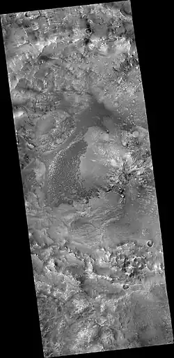 The ejecta deposits of Hargraves were emplaced in at least two stages.[2] This is consistent with models for layered ejecta morphologies previously identified at the Ries impact structure in Bavaria, Germany, and the Mistastin impact structure in Labrador, Canada.[2] The older ejecta unit (termed He1 by Sacks and co-authors[2]) is a lighter-toned unit composed of two facies that can be morphologically distinguished based on differentially hummocky textures; coherent megablocks abound within the unit. The unit has been interpreted as a lithic impact breccia formed during a period of ballistic sedimentation.[2] Although Hargraves impacted into Isidis-related megabreccias, this impact breccia unit can be distinguished spectrally from local megabreccia outcrops, and likely sampled strata in addition to the aforementioned megabreccia unit.[2]