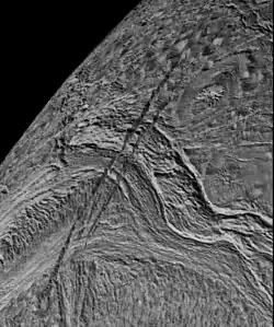 Harran Sulci is a region of grooved terrain on the surface of Saturn's moon Enceladus. The feature is centered at 26.7° North Latitude, 237.6° West Longitude and is approximately 276 kilometers long. Harran Sulci bounds Diyar Planitia to the north and east.