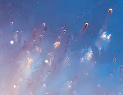 These knots are radially symmetric (from the CS) and are described as "cometary", each centered on a core of neutral molecular gas and containing bright local photoionization fronts or cusps towards the central star and tails away from it.[14] All tails extend away from the Planetary Nebula Nucleus (PNN) in a radial direction. Excluding the tails, each knot is approximately the size of the Solar System, while each of the cusp knots are optically thick due to Lyc photons from the CS.[2][5][15] There are about 40,000 cometary knots in the Helix Nebula.[16]