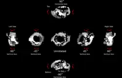 The Helix Nebula is thought to be shaped like a prolate spheroid with strong density concentrations toward the filled disk along the equatorial plane, whose major axis is inclined about 21° to 37° from our vantage point. The size of the inner disk is 8×19 arcmin in diameter (0.52 pc); the outer torus is 12×22 arcmin in diameter (0.77 pc); and the outer-most ring is about 25 arcmin in diameter (1.76 pc). The outer-most ring appears flattened on one side due to it colliding with the ambient interstellar medium.[11]