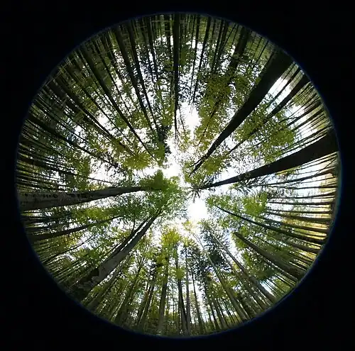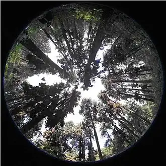Hemispherical photography, also known as canopy photography, is a technique to estimate solar radiation and characterize plant canopy geometry using photographs taken looking upward through an extreme wide-angle lens or a fisheye lens (Rich 1990). Typically, the viewing angle approaches or equals 180-degrees, such that all sky directions are simultaneously visible. The resulting photographs record the geometry of visible sky, or conversely the geometry of sky obstruction by plant canopies or other near-ground features. This geometry can be measured precisely and used to calculate solar radiation transmitted through (or intercepted by) plant canopies, as well as to estimate aspects of canopy structure such as leaf area index. Detailed treatments of field and analytical methodology have been provided by Paul Rich (1989, 1990) and Robert Pearcy (1989).