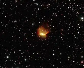 The planetary nebula is asymmetric, which is the result of there being not a single star, but a binary system at the heart of the nebula.[2][3][4][5]