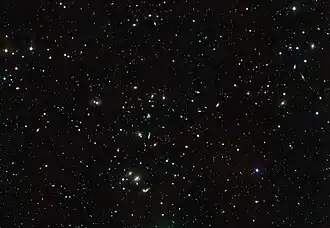 The Hercules Cluster (Abell 2151) is a cluster of about 200 galaxies[4] some 500 million light-years distant in the constellation Hercules. It is rich in spiral galaxies and shows many interacting galaxies.[5] The cluster is part of the larger Hercules Supercluster, which is itself part of the much larger Great Wall super-structure.[6]