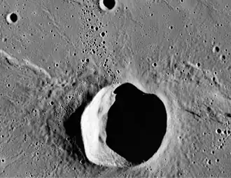 Herigonius is a small lunar impact crater that is located in the southern part of the Oceanus Procellarum, to the northeast of the crater Gassendi. It was named after French mathematician and astronomer Pierre Hérigone.[1] Herigonius is roughly circular, with an inward bulge and narrower inner wall along the northeast. In the interior of the sloping inner walls is a floor about half the diameter of the crater.