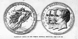 In 1869, a commemorative medal honoring the discovery of the 100th asteroid shows the profiles of John Russel Hind, Hermann Goldschmidt and Robert Luther.[13]