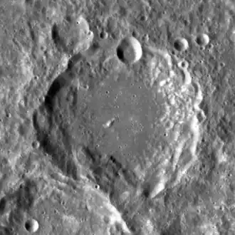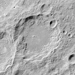 This is a somewhat worn crater formation with a wide inner wall. There is a pear-shaped crater along the northern inner wall. The interior floor is relatively featureless, with only a small ridge offset to the southwest of the midpoint.