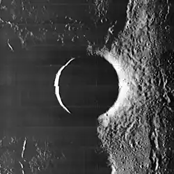 Hevelius is a low-rimmed lunar impact crater that lies at the western edge of the Oceanus Procellarum, named after the astronomer Johannes Hevelius by the IAU in 1935.[1] The smaller but prominent crater Cavalerius is joined to the northern rim by low ridges. Due south of Hevelius is the crater Lohrmann and the dark-hued Grimaldi.