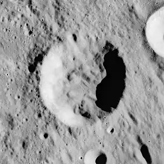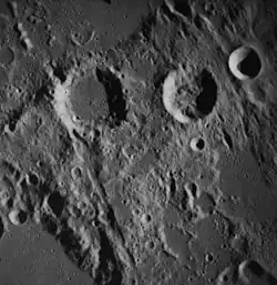Hind is a lunar impact crater that lies to the southeast of the walled plain Hipparchus, and due east of the crater Halley. Its diameter is 29 km. It was named after British astronomer John Russell Hind.[1] The rim of Hind is relatively free of wear and distortion, except for a break at the north rim. The floor of Hind is relatively uneven, however, compared to the interior of Halley. Hind and the craters Hipparchus C and Hipparchus L form a line with diminishing diameters that point to the northeast.