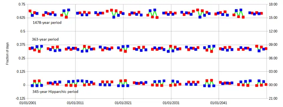 The period of Hipparchus is also accurate in the sense of always having the same length to within an hour. This is due to the fact that it is close to a whole number of anomalistic years as well as to a whole number of anomalistic months. Its average length is actually 126007.023 days, half an hour less than what Ptolemy says. This is equivalent to 345 Julian years minus 4.227 days (implying that in the Gregorian calendar the date usually goes back by just one or two days, sometimes by three), which is only about 8 days less than 345 anomalistic years. There are few eclipse periods that are so constant – the semester for example (six synodic months) can vary by a day in each direction.