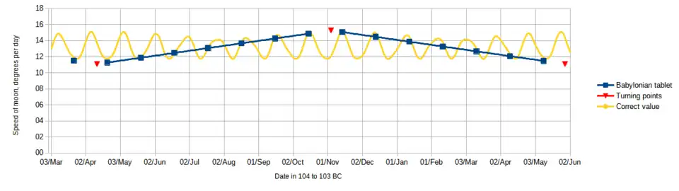 Franz Xaver Kugler in his Die Babylonische Mondrechnung claimed that the Chaldaeans could have known about this cycle of 251 months, because it falls out of their system of calculating the speed of the moon, seen in a tablet from around 100 BC.[2] In their system, the speed of the moon at new moon varies in a zigzag, with a period of one full moon cycle, changing by 36 arc minutes each month over a span of 251 arc minutes (see graph), and this implies that after 251 months the pattern repeats, and 269 anomalistic months will have gone by. So it is possible that Hipparchus constructed his 345-year cycle by multiplying this 20-year cycle by 17 so as to closely match an integer number of synodic months (4,267), anomalistic months (4,573), years (345), and days (a bit over 126,007). It is also close to a half-integer number of draconic months (4,630.53...), making it an eclipse period. By comparing his own eclipse observations with Babylonian records from 345 years earlier, he could verify the accuracy of the various periods that the Chaldean astronomers used.