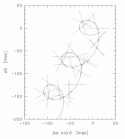 The path on the sky of one of the Hipparcos Catalogue objects, over a period of three years. Each straight line indicates the observed position of the star at a particular epoch: because the measurement is one-dimensional, the precise location along this position line is undetermined by the observation. The curve is the modelled stellar path fitted to all the measurements. The inferred position at each epoch is indicated by a dot, and the residual by a short line joining the dot to the corresponding position line. The amplitude of the oscillatory motion gives the star's parallax, with the linear component representing the star's proper motion.