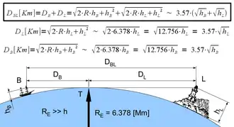 where the constant equals k=3.57 km/m½=1.22 mi/ft½. In this equation, Earth's surface is assumed to be perfectly spherical, with R equal to about 6,371 kilometres (3,959 mi).