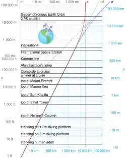 - For an observer atop Mount Everest (8,848 metres (29,029 ft) in altitude), the horizon is at a distance of 336 kilometres (209 mi).
