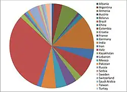 By 2019, 122 students were enrolled in the IRAP PhD program:[49] 1 from Albania, 4 from Argentina, 8 from Armenia, 1 from Austria, 2 from Belarus, 16 from Brazil, 5 from China, 9 from Colombia, 3 from Croatia, 5 from France, 5 from Germany 7 from India, 2 from Iran, 38 from Italy 2 from Kazakhstan, 1 from Lebanon, 1 from Mexico, 1 from Pakistan, 4 from Russia, 1 from Serbia, 1 from Sweden, 1 from Switzerland, 1 from Saudi Arabia, 2 from Taiwan and 1 from Turkey.