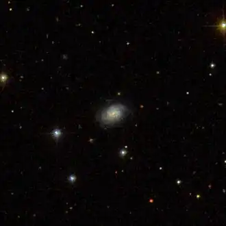 IC 1011 is a barred spiral galaxy[1] with apparent magnitude of 14.7,[3] and with a redshift of z=0.02564 (SIMBAD)[1] or 0.025703 (NASA),[3] yielding a distance of 100 to 120 megaparsecs.[3] Its light takes 349.5 million years to reach Earth. IC 1011's calculated age is approximately 12.95 billion years.[3] The IC designation comes from the Index Catalogue.