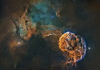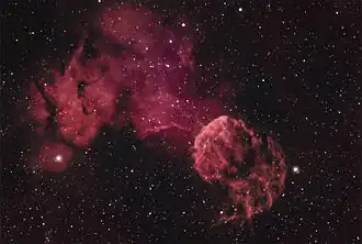 IC 443 (also known as the Jellyfish Nebula and Sharpless 248 (Sh2-248)) is a galactic supernova remnant (SNR) in the constellation Gemini. On the plane of the sky, it is located near the star Eta Geminorum. Its distance is roughly 5,000 light years from Earth.