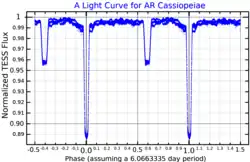 In 1921, Joel Stebbins announced that observations from 1917 through 1921 had shown that the star is an eclipsing binary.[14] AR Cassiopeiae A is an Algol-type eclipsing binary with an orbital period of about 6.07 days.[4] Its primary is a B-type main-sequence star, and the secondary an A-type main-sequence star. The secondary star may be an Am star.[4]