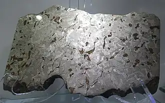 They have mineral compositions and oxygen isotope ratios very similar to the H chondrites, which makes it probable that they originate from the same parent body. The best candidate for this parent body is the S-type asteroid 6 Hebe.[1] Unlike most iron meteorites, the type IIE are thought to have been melted out of the chondritic surface of the parent asteroid by impacts during its early history.