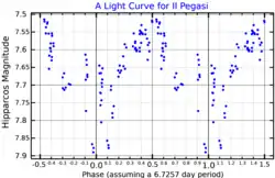 II Pegasi is a binary star system in the constellation of Pegasus with an apparent magnitude of 7.4 and a distance of 130 light-years. It is a very active RS Canum Venaticorum variable (RS CVn), a close binary system with active starspots.