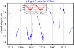 ![]() A visual band light curve for IK Tauri, plotted from ASAS-SN data.[1] The main plot shows the brightness as a function of time, and the inset shows the same data plotted as a function of pulsation phase. | |