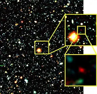 - ↑ Iye, Masanori; Ota, Kazuaki; Kashikawa, Nobunari; Furusawa, Hisanori; Hashimoto, Tetsuya; Hattori, Takashi; Matsuda, Yuichi; Morokuma, Tomoki; Ouchi, Masami; et al. (2006), "A galaxy at a redshift z = 6.96", Nature, 443 (7108): 186–188, arXiv:astro-ph/0609393v1, Bibcode:2006Natur.443..186I, doi:10.1038/nature05104, PMID 16971942, S2CID 2876103