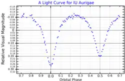 IU Aurigae is a triple star[6] system in the constellation Auriga, consisting of an eclipsing binary pair orbiting a third component with a period of 335 years.[7] This system is too faint to be viewed with the naked eye, having a peak apparent visual magnitude of 8.19.[3]