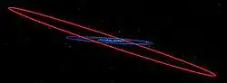 The fourth flyby happened on April 8, 2006, at a distance of approximately 866,000 km (538,000 mi), and this time, Cassini crossed Iapetus's orbit.[57] After this, Cassini's orbit was made smaller once again, preventing the probe from approaching Iapetus for more than a year this time.