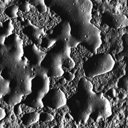 There are several dozen hills within Ina. They are diverse in size and have rounded amoeba-like edges, like drops of mercury.[1][2] Many of them are interconnected with other hills or with the edge of the depression.[1] They are rather low (5–25 m, usually 10–15 m[1][15][18]). Their tops are flat or slightly rounded while their slopes are steep. The edges of the hills are usually very sharp. Often they are surrounded by a little moat. The boundary between the hills and the lowland has the same appearance as the outer boundary of the depression. The surface of the hills is very smooth compared to the lowlands. In addition, although the sample size is not great, the hills do have an impact crater density intermediate between the fresh lowlands and the ancient neighboring plains of Lacus Felicitatis.[1][10]