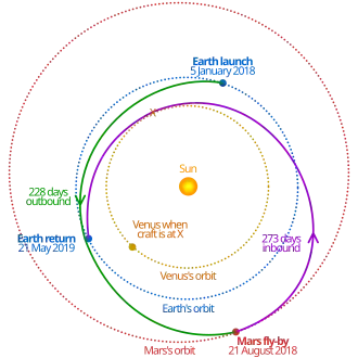 They proposed a free return trajectory to allow the spacecraft to use the smallest possible amount of propellant to flyby Mars and return to Earth.[17] They stated that the January 2018 launch window offered a rare orbit opportunity to travel to Mars and return to Earth in 501 days.[14]