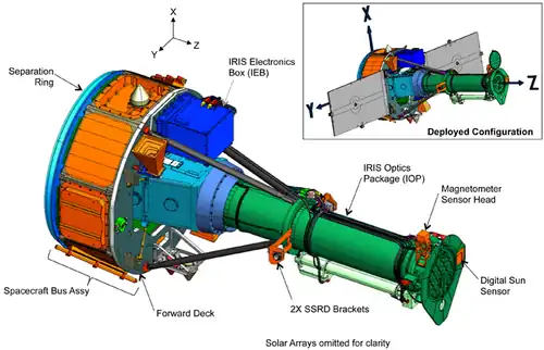 ![]() The IRIS satellite with solar arrays in deployed configuration and telescope front door closed | |