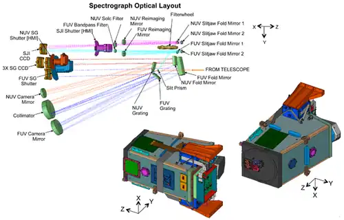 The IRIS instrument is a multi-channel imaging spectrograph with a 19 cm (7.5 in) ultraviolet telescope. IRIS obtains a spectra along a slit (1/3 arcsecond wide), and slit-jaw images. The charge-coupled device (CCD) detectors has 1/6 arcsecond pixels. IRIS will have an effective spatial resolution between 0.33 and 0.40 arcsecond and a maximum field of view (FoV) of 120 arcseconds. The far-ultraviolet channel covers 133.2-135.8 nm and 139.0-140.6 nm with an 0.04 nm resolution and an effective area of 2.8 cm2 (0.43 sq in). The near-ultraviolet channel covers 278.5-283.5 nm with an 0.08 nm resolution and an effective area of 0.3 cm2 (0.047 sq in).[7] Slit-jaw imaging has four passbands: 133.5 nm and 140.0 nm with a 4 nm bandpass each; and 279.6 nm and 283.1 nm with a 0.4 nm bandpass each. IRIS has a high data rate (0.7 Mbit/s on average) so that the baseline cadence is 5 seconds for slit-jaw images and 1 second for six spectral windows, including rapid rastering to map solar regions.[8]