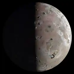 During several orbits, Juno has observed Io from a distance using JunoCam, a wide-angle, visible-light camera, to look for volcanic plumes and JIRAM, a near-infrared spectrometer and imager, to monitor thermal emission from Io's volcanoes.[67][62] JIRAM near-infrared spectroscopy has so far allowed for the coarse mapping of sulfur dioxide frost across Io's surface as well as mapping minor surface components weakly absorbing sunlight at 2.1 and 2.65 μm.[68]