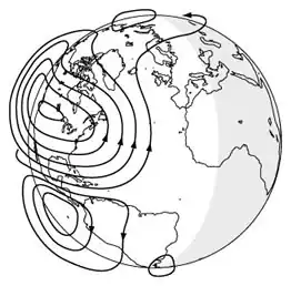 Within approximately ± 20 degrees of the magnetic equator, is the equatorial anomaly.[26][27] It is the occurrence of a trough in the ionization in the F2 layer at the equator and crests at about 17 degrees in magnetic latitude.[26] The Earth's magnetic field lines are horizontal at the magnetic equator. Solar heating and tidal oscillations in the lower ionosphere move plasma up and across the magnetic field lines. This sets up a sheet of electric current in the E region which, with the horizontal magnetic field, forces ionization up into the F layer, concentrating at ± 20 degrees from the magnetic equator. This phenomenon is known as the equatorial fountain.[28]