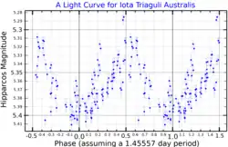 Iota Trianguli Australis is a double-lined spectroscopic binary system with an orbital period of 39.88 days and an eccentricity of 0.25. The brighter member, component A, is yellow-white hued F-type subgiant star and a Gamma Doradus type variable, pulsating by 0.12 magnitudes with a dominant period of 1.45 days.[5]