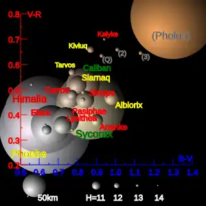 The large Uranian irregular satellites (Sycorax and Caliban) are light red, whereas the smaller Prospero and Setebos are grey, as are the Neptunian satellites Nereid and Halimede.[21]