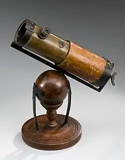 From this work, he concluded that the lens of any refracting telescope would suffer from the dispersion of light into colours (chromatic aberration). As a proof of the concept, he constructed a telescope using reflective mirrors instead of lenses as the objective to bypass that problem. Building the design, the first known functional reflecting telescope, today known as a Newtonian telescope, involved solving the problem of a suitable mirror material and shaping technique.[82] He grounded his own mirrors out of a custom composition of highly reflective speculum metal, using Newton's rings to judge the quality of the optics for his telescopes. In late 1668,[83] he was able to produce this first reflecting telescope. It was about eight inches long and it gave a clearer and larger image. In 1671, he was asked for a demonstration of his reflecting telescope by the Royal Society.[84] Their interest encouraged him to publish his notes, Of Colours,[85] which he later expanded into the work Opticks. When Robert Hooke criticised some of Newton's ideas, Newton was so offended that he withdrew from public debate. However, the two had brief exchanges in 1679–80, when Hooke, who had been appointed Secretary of the Royal Society,[86] opened a correspondence intended to elicit contributions from Newton to Royal Society transactions,[87] which had the effect of stimulating Newton to work out a proof that the elliptical form of planetary orbits would result from a centripetal force inversely proportional to the square of the radius vector.[88]
