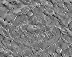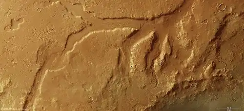 Ismeniae Fossae is a region containing irregular valleys on Mars. It is 287 km across and centered at 41°19′N 38°21′E / 41.31°N 38.35°E.[1] It is located in the Ismenius Lacus quadrangle. It is along the dichotomy boundary that is between the old, heavily cratered southern highlands and the low plains of the northern hemisphere. Ismeniae Fossae is to the immediate west of Moreux crater. The regions of plateaus known as Deuteronilus Mensae and Protonilus Mensae are to the northwest and northeast of Ismeniae Fossae.