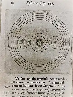 Du Chevreul rejected the Copernican theories on the system of the universe for many reasons. First, he believed that the Earth was at the center of the universe and did not orbit. He used the teachings of Plato, Aristotle, and other philosophers and astrologers who asserted this geocentric idea and cited Plato in the Timaeus and Phaedo and Aristotle in the De caelo.[1] Second, he looked to passages in the Bible for theological support. One passage stated that when God created the Earth, he did not intend for it to move. Another passage referenced the miracle witnessed by the biblical character Joshua in which God halted the movement of the Sun and the Moon. The use of Biblical Scriptures was consistent with the 1616 condemnation of Copernicanism by the Catholic Church as well as du Chevreul's own views on religion and astronomy.[1] Du Chevreul also argued that Copernicus's theories were inconsistent with the physics concerning the motion of a simple body because Copernicus believed the simple body- the Earth- would have two motions however simple bodies can only have a single and simple motion. Even though he claimed that Earth was at the center of the universe, du Chevreul also claimed that Venus and Mercury orbited the Sun. The root of this theory was his claim that spots seen on the Sun are actually Venus and Mercury rather than the fact that they have phases like the Moon.[1]